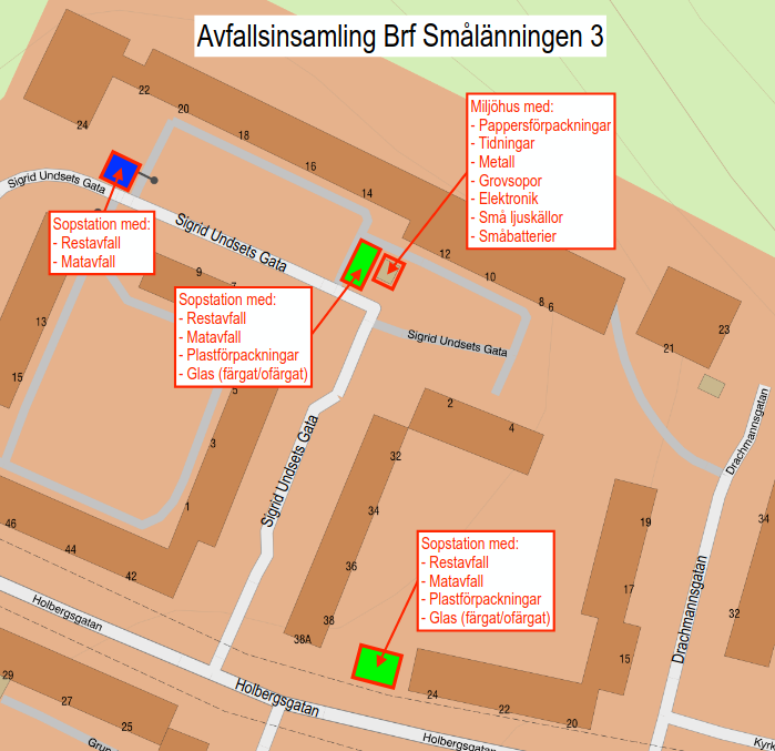 Vid Sigrid Undset Gata 24 finns det behållare för hushållssopor samt matavfall.